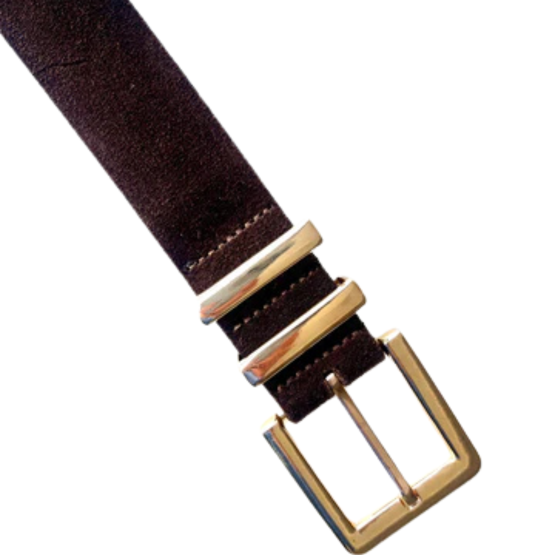 Cinto Couro Priscila (Camurça Marrom com Fivela Dourada). Em até 4x.